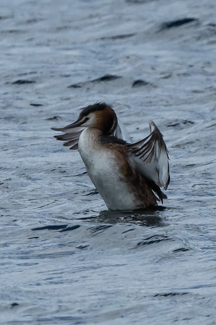 At Llys-y-fran, the water was a bit choppy in the breeze, but we noted at least 9 Great Crested Grebes, including one bird that was carrying a small fish into one of the more sheltered embayments, on the opposite side of the reservoir, suggesting that breeding had been successful.